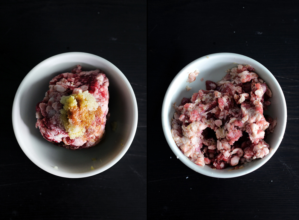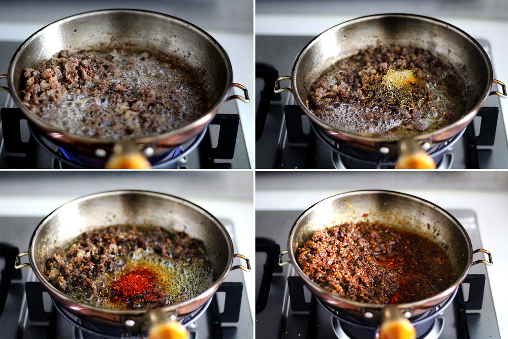 Heat up 3 tbsp of olive oil in a skillet over medium-high heat, then add the ground lamb-mixture. Cook until the lamb is evenly browned (If water starts to release out of the lamb in the beginning, don’t worry. The moisture will eventually be cooked off), then add the spice-mixture and cook until the chili flakes start to darken in colour, approx 3~4 min. Add the grated garlic, grated ginger and sugar, cook for a few seconds then turn off the heat completely.