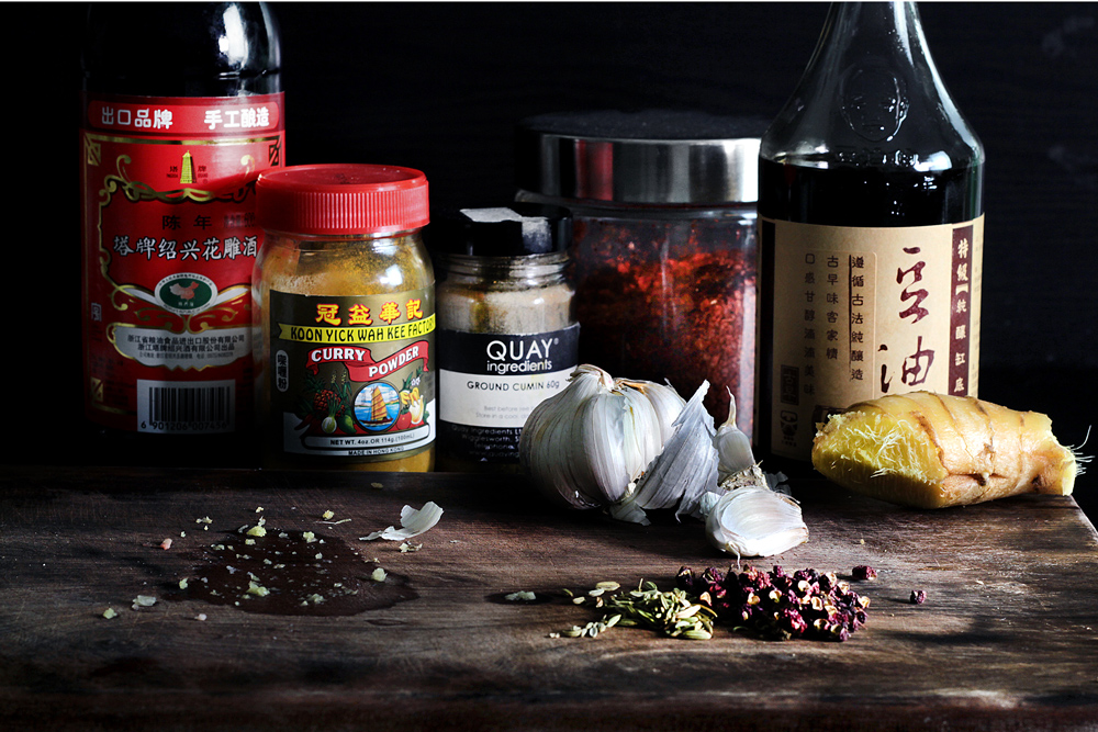 Evenly mix together the fatty ground lamb, grated ginger, grated garlic, shao-xing wine, soy sauce and salt together. Set aside to marinate for 10 min. Coarsely grind up the red sichuan peppercorn in a stone mortar, or spice-grinder. Then mix together with chili flakes, ground cumin, ground fennel, ground white pepper and curry powder. Set aside.