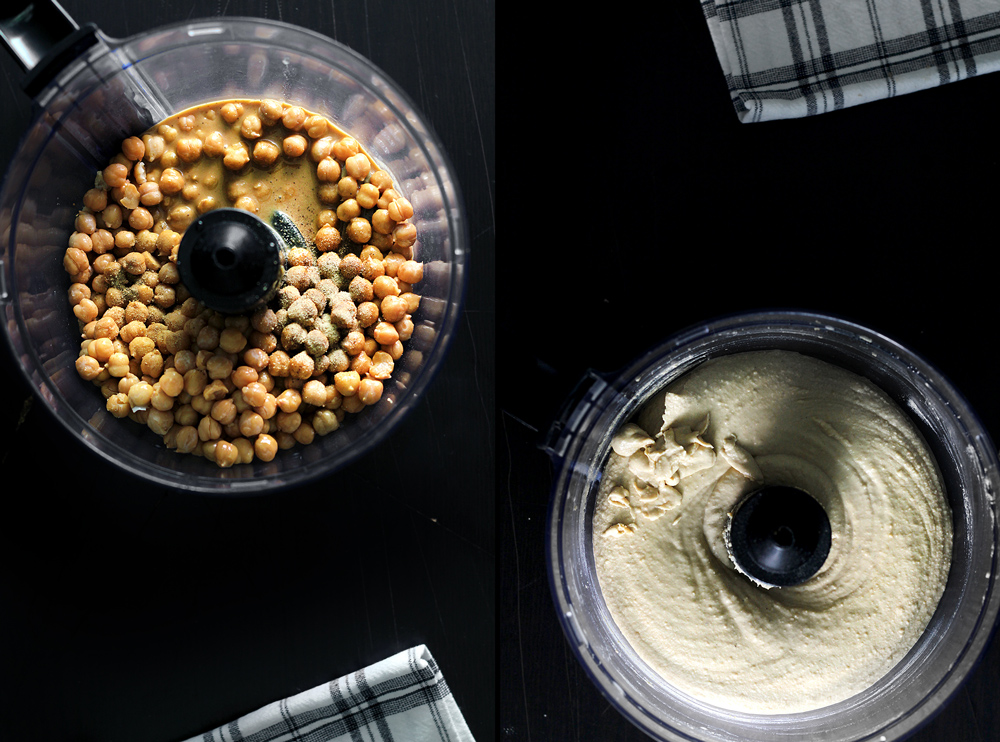 To make the hummus: Drain the liquid from the canned chickpeas and peel off the skin (just a sturdy pinch should do it). Then add the peeled chickpeas, toasted sesame paste, lemon juice, salt and ground white pepper in a food-processor, and pulse until the chickpeas are ground to a coarse meal-consistency. With the machine running, slowly drizzle in 1/4 of water and continue blending until the mixture is smoothly pureed. If the hummus appears to be too thick, add a couple tbsp more of water.
