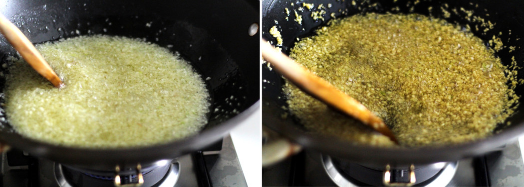 Warm up (not hot) 1 cup of vegetable oil in a wok/pot over medium-high heat. Drop a piece of garlic into the oil, and if it slowly bubbles up and floats to the surface, the oil’s ready (remove the tester-garlic or it’ll burn). Lower the heat down to medium, then add all the garlic at once. Keep stirring and keep stirring with a wooden spoon (don’t stop stirring or the garlics close to the edge of the wok/pot will brown faster) until the garlics start to turn into pale-golden (think lightly roasted peanuts). Turn off the heat completely at this point, and keep stirring with the residual heat. Once the garlics turn into light-golden, immediately drain them through the fine sieve. You want to remove the garlics from heat just a little earlier because they will continue to darken into medium-golden once drained. Any darker than a medium golden-brown will taste bitter. You should have about 1 1/2 cup of fried garlic.