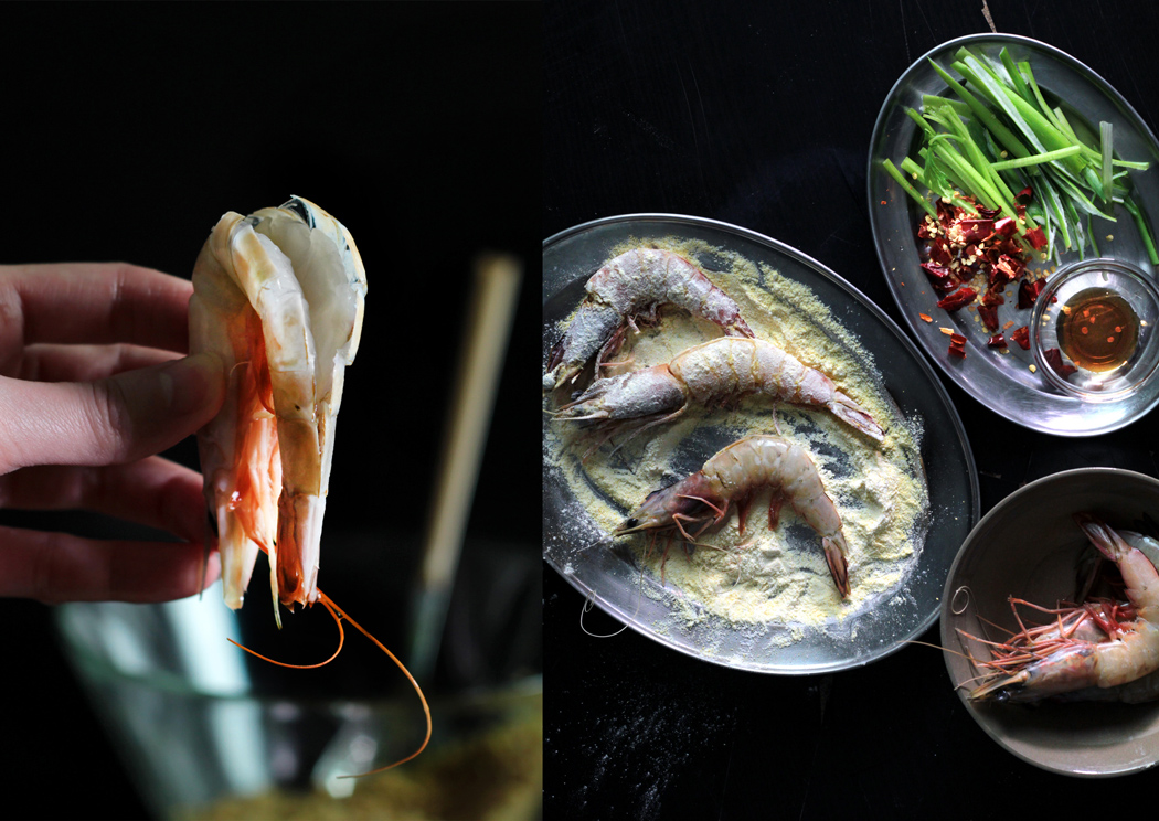 Use a scissor to cut the shrimp-shells open along the back, all the way to the tails. Devein the shrimps, then score the meats open with a small knife without cutting through (see picture). Evenly mix together 2 tbsp of all-purpose flour and 2 tbsp of fine cornmeals, season with a small pinch of salt. Light coat the shell of the shrimps in the flour-mixture, then dust off any excess flour. Set aside.
