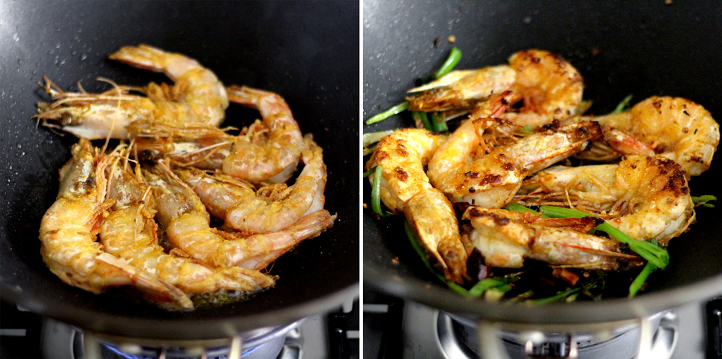 Heat up 3 tbsp of the reserved garlic oil in a wok/deep skillet on high heat until smoking. Lay the shrimps flat on one side in the wok/skillet to fry, then don’t move them. Once the first side is blistered and crispy, add the diced dried chili and turn them over to fry the other sides. It’s important not to stir them or move them around too much, otherwise they won’t fry properly. Once both sides are crispy, add the scallions, celery and 1/2 tsp of fish sauce, stir gently and cook until the scallions have just wilted. Now turn off the heat completely, and add the fried garlic-mixture, and the remaining 1/2 tsp of fish sauce. The residual heat is enough to do the rest of the job, but won’t burn the garlics. Fold gently again to have everything combined.