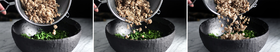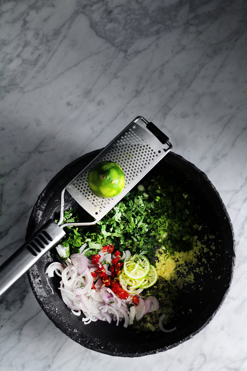 Mix ground pork-shoulder with 1 tsp of fish sauce and cornstarch until even. Heat up a non-stick skillet with 2 tsp of oil over medium-high heat, and sauté while breaking up the pork with a wooden spoon until it’s slightly browned. Let the pork cool completely over a fine sieve to eliminate excess oil. In a mortar, or spice-grinder or food-processor, grind the chopped lemongrass and kaffir lime leaves (use only the leaf-part without the mid-stem) until finely bashed up. Transfer to a large bowl, and add finely sliced shallots, chilis, scallion, cilantro, mint, grated ginger and lime zest (if you’re using small Asian limes with thin skin, 4~5 very thin slices added to the salad can bring refreshing zing). Add the cooled ground pork-shoulder, lime juice, fish sauce and ground white pepper. Toss the mixture until evenly combined. Re-season with more fish sauce if need be.