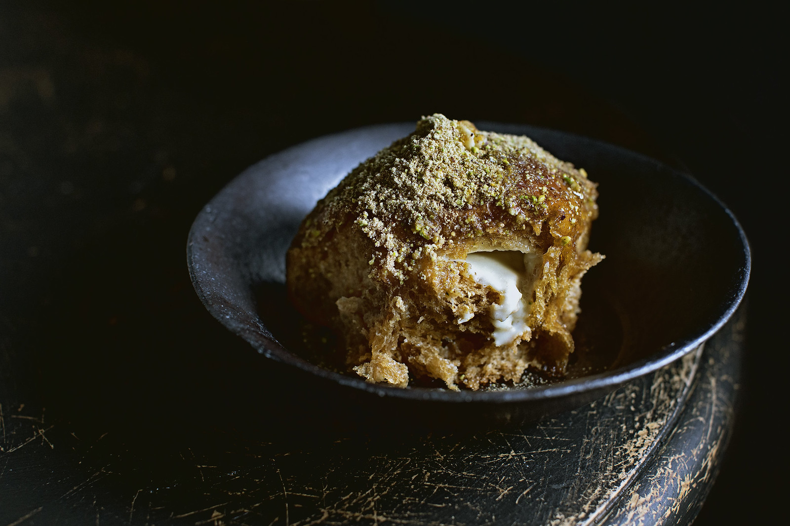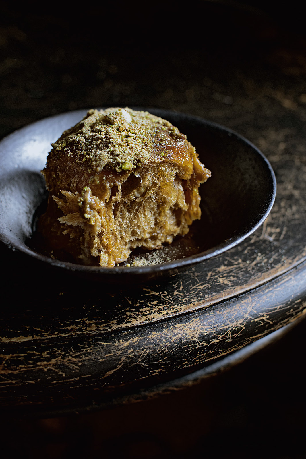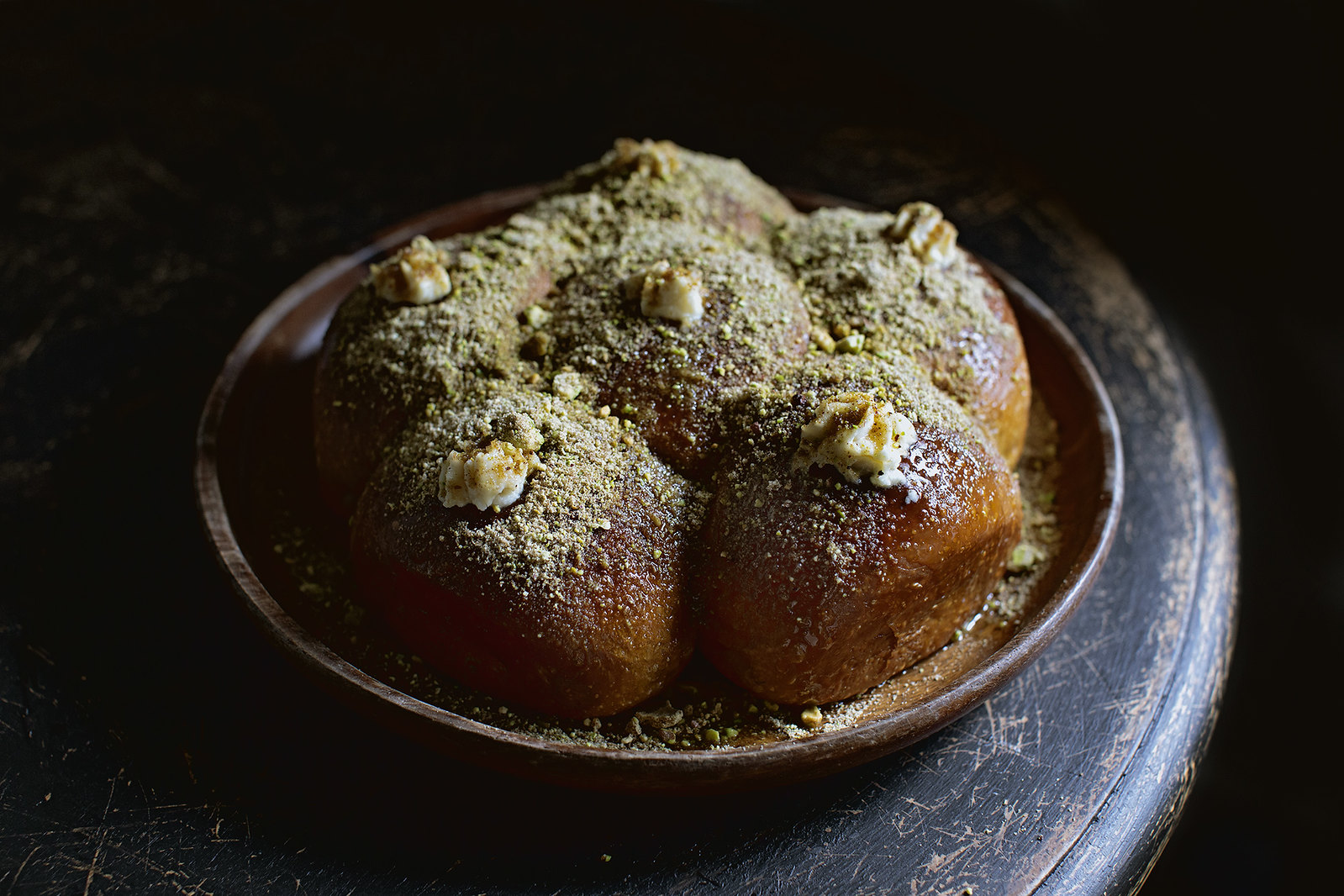 Think of it this way: You take a brioche dough, and you instill it with a little bit of that Japanese tangzhong wisdom (a bread dough with part of its flour cooked, like a roux, to enhance moisture retention and texture). But instead of making the tangzhong with milk, you do it entirely with Kahlua coffee liquor, you see? With the alcohol cooked off, what is pleasantly left behind is the silhouettes of sugar canes, sweet butter and roasted chestnuts. You bake it in a very user-friendly bun-form, which already has stringy and translucent, soft and chewy crumbs. But what it lacks, or in fact is screaming desperately for, is a good piping of lightly sweetened mascarpone cream which cannot either confirm or deny that it has more Kahlua in it. At this point, it’s too late to be sensical, so we might as well douse the buns with more melted butter, so much so that it becomes a welcoming wetland to entrap an onslaught of boldly salted spiced sugar, which is really powdered pistachio.